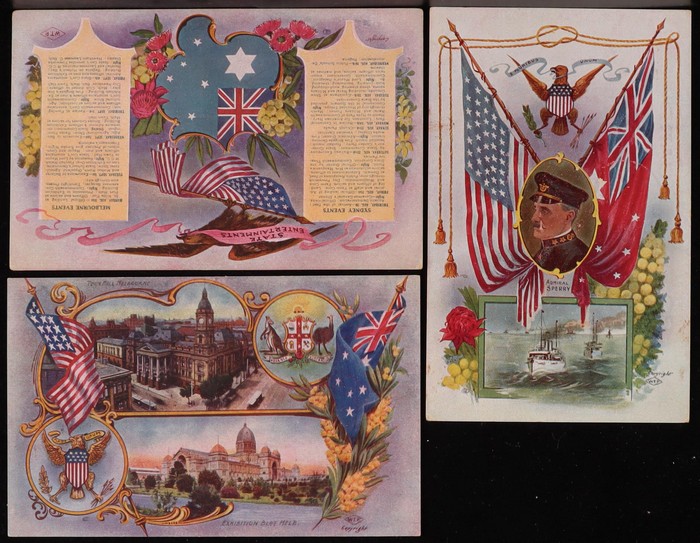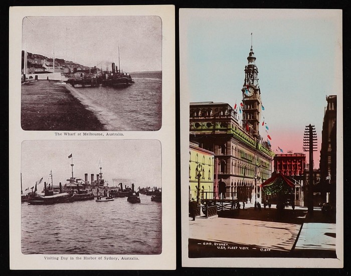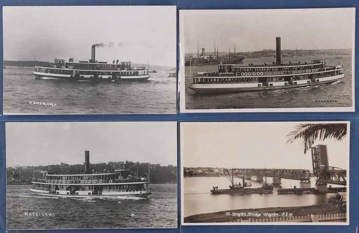 Ferries collection (42) with 1908 USA Fleet Visit (2) with official Victorian 1d, 1½d Postal Cards & USA/Aust Flags featuring Melbourne Street Scenes. NSW Sydney Harbour Ferry collection (20) inc Showboat Kalang, Binngarra, South Steyne.