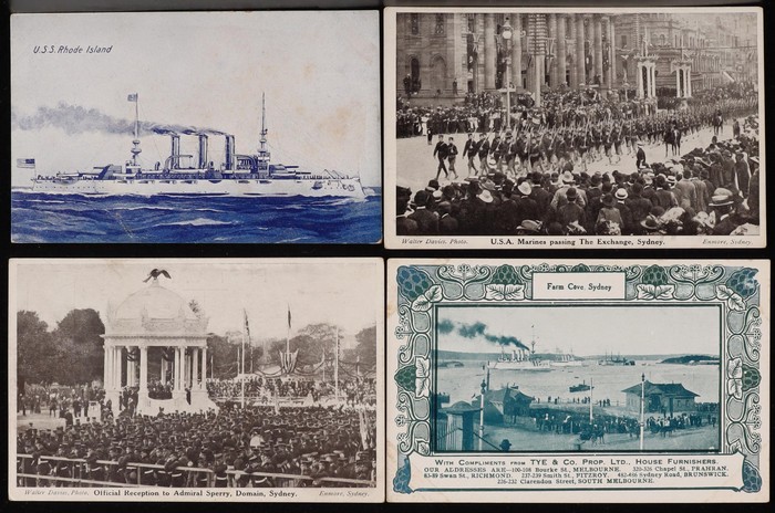 Visit 1908, WTP series (3 inc Timetable for Sydney & Melbourne Events), Official Reception, Domain (2), Parade Passing The Exchange, Melbourne/Sydney Views (2), Decorations at GPO tinted real photo, Tye & Co Advertising Card, W&B series (3, USS Ohio,