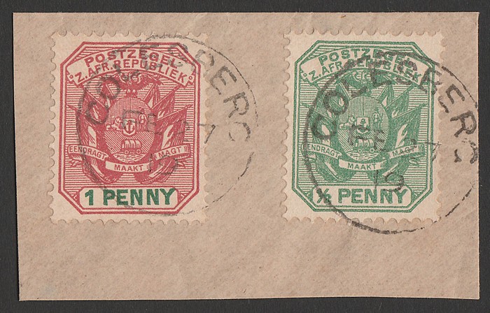 invasion of Cape Colony Postmark: CDS 'Colesberg FE 27 19' on Transvaal Arms ½d & 1d - year error confirmed by other items from same source, apparently the new century postmarkers yet to arrive. SG 216-17. (2). (Image1)