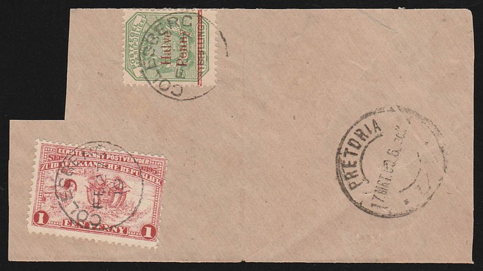 invasion of Cape Colony - Postmark: CDS 'Colesberg FE 27 19' on Transvaal Arms ½d on 1/-, & Pictorial 1d with '19' meant to represent '1900' -year error confirmed by Pretoria 1900 cds on same piece, apparently the new century postmarkers yet