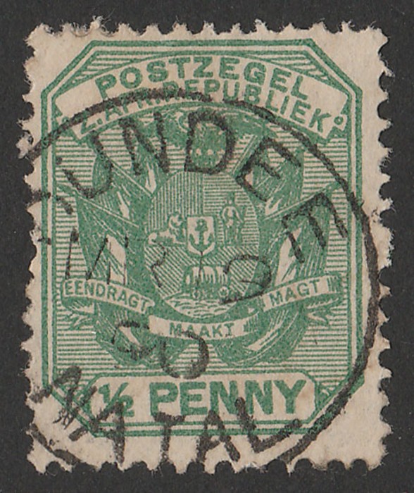 invasion of Natal Postmark: CDS 'Dundee Natal MR 10 00' on Transvaal Arms ½d green near full strike. SG 216. (Image1)