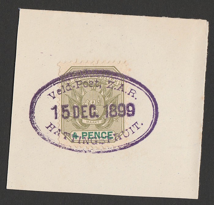 invasion of Natal Postmark: Oval 'Veldpost ZAR Hattingspruit 15 DEC 1899' on Transvaal Arms 4d olive & green, full violet strike on piece. SG 221. (Image1)