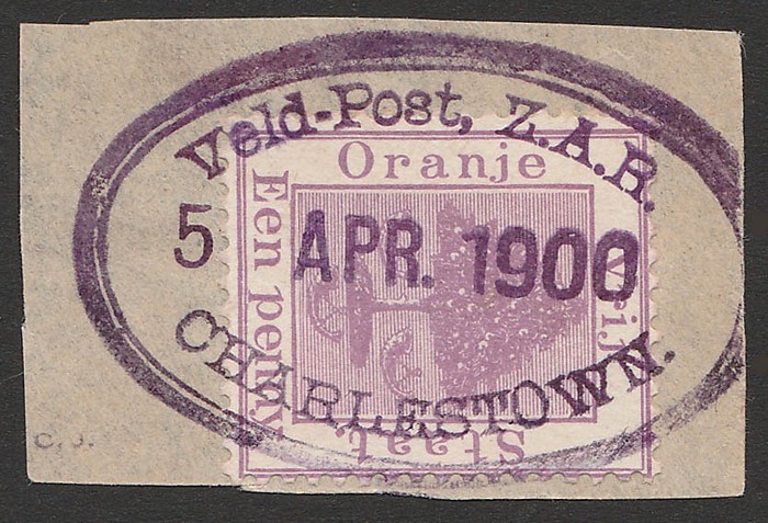 invasion of Natal Postmark: Oval 'Veld-Post ZAR Charlestown 5 APR 1900' on OFS Tree 1d purple, full violet strike on piece. SG 68. Rare combination. (Image1)
