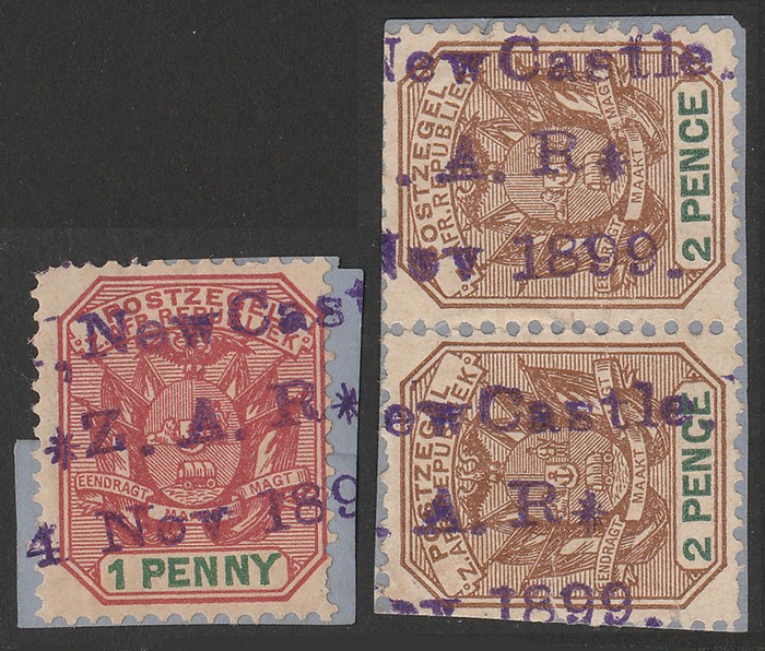 invasion of Natal Postmark: 3-line Newcastle ZAR 4 Nov 1899' on Transvaal Arms 1d & 2d pr near full violet strikes on pieces. SG 217-18. (3). (Image1)