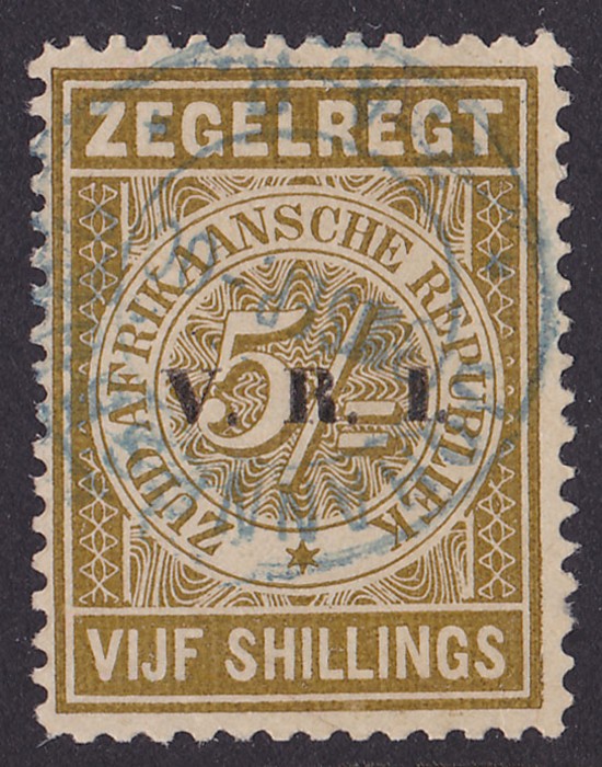 Postal Fiscal 5/- dark olive. VFU, 'Johannesburg SEP 01' blue cds. SG footnote unpriced. Higher values were provisionally used on Telegrams & are very scarce (most U lower values originate thus). The highest value priced is the 2/6 at £150,
