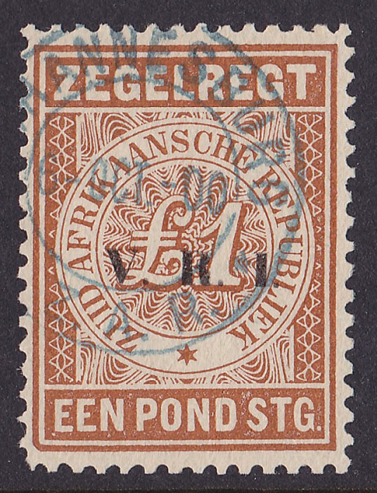 Postal Fiscal £1 brown. VFU, 'Johannesburg 6 OCT 00' blue cds. SG footnote unpriced. Higher values were provisionally used on Telegrams & are very scarce (most U lower values originate thus). The highest value priced is the 2/6 at £150,