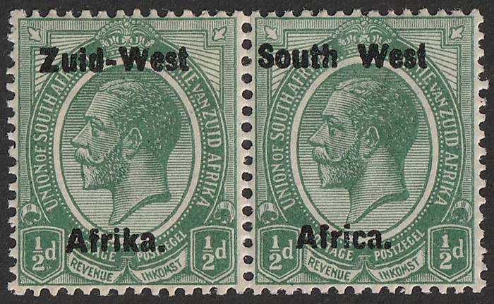 KGV ½d green, bilingual horiz pr, Litho opt in shiny ink. VF fresh MNH. Scott 1(var). SG 1d cat £13 for M prs, should be at least double £26 MNH.