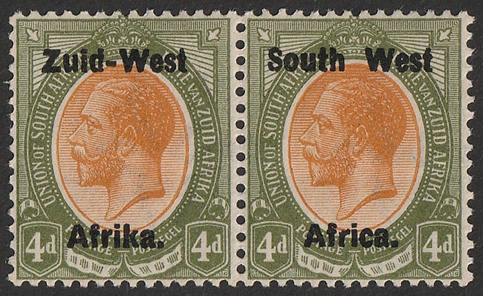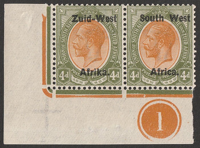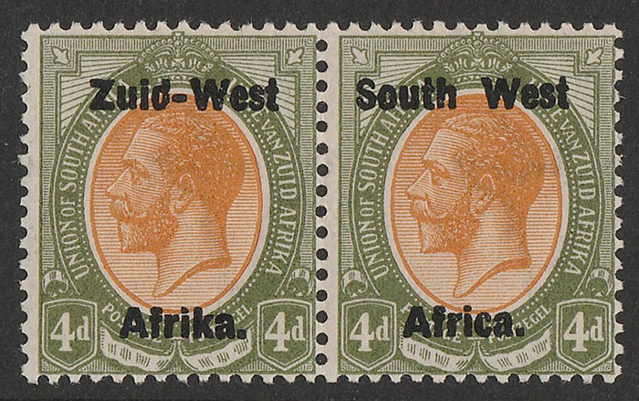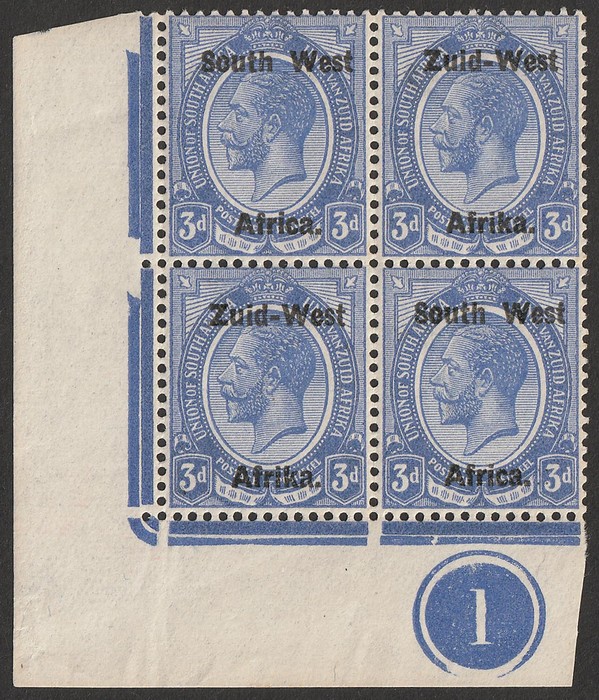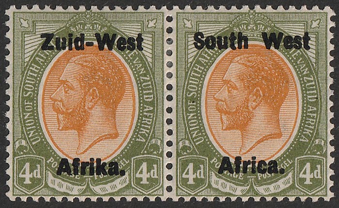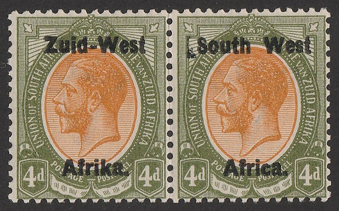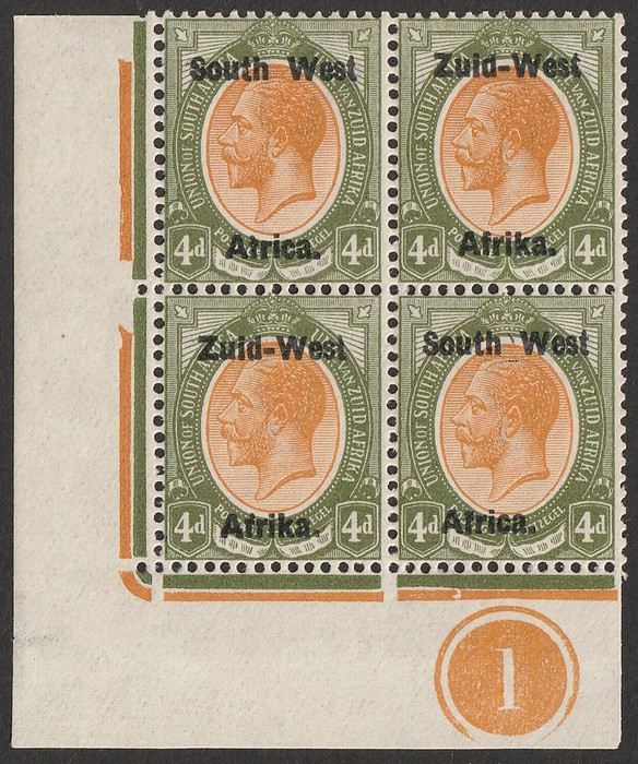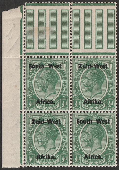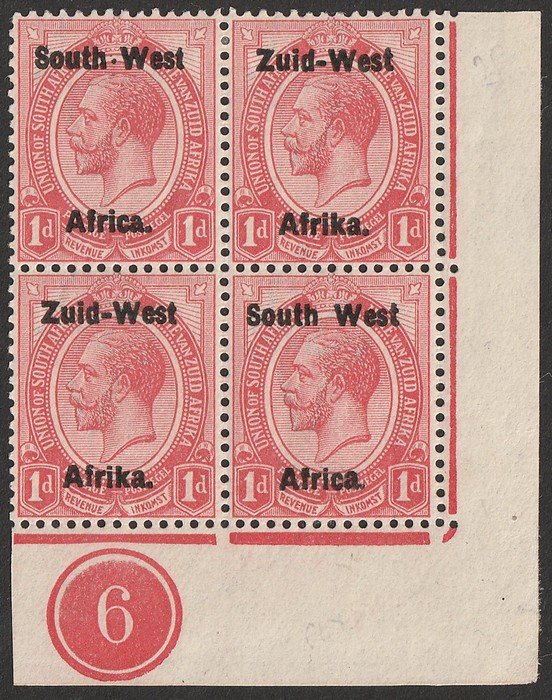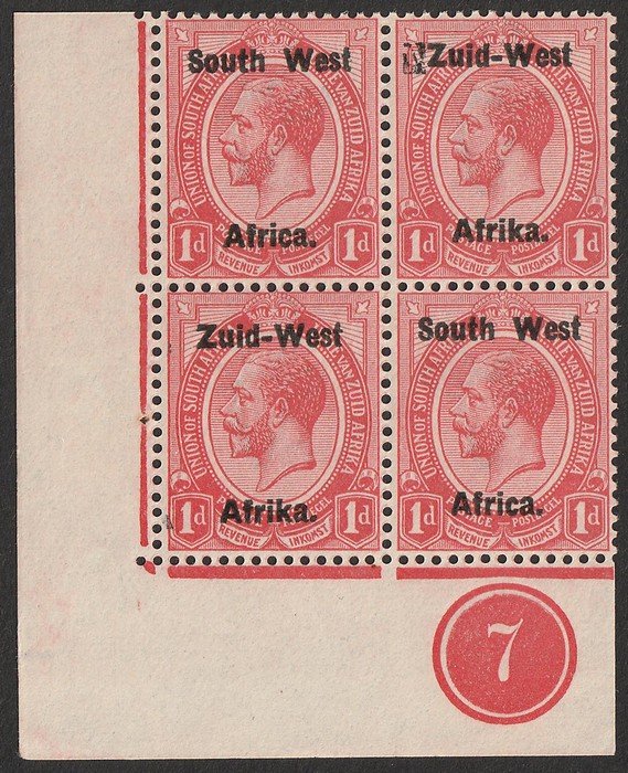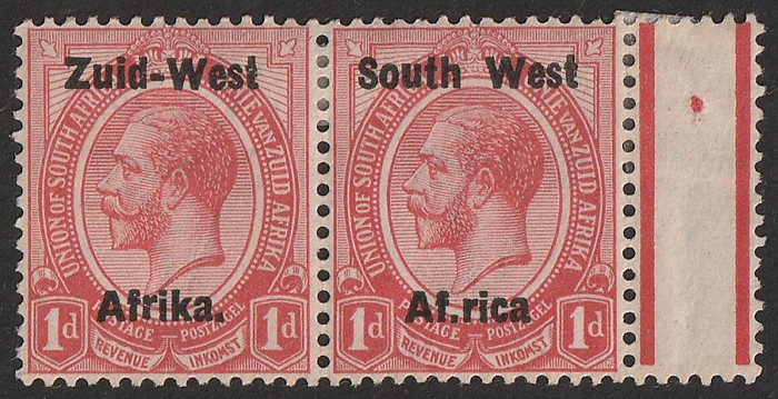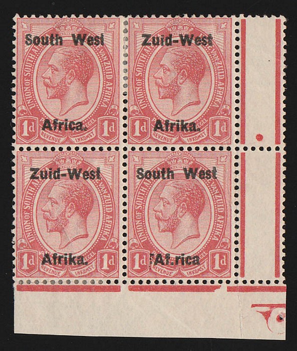 KGV 1d rose-red, LR gutter marginal se-tenant blk of 4 (2 prs) LR stamp variety 'Af.rika for Africa' VF fresh 3M/1MNH, variety superb MNH. SG 2/2c cat £189 as M should be at least double, £378 MNH variety, plus premium for positional blk.
