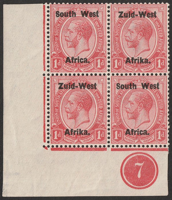 KGV 1d rose-red, LL cnr marginal bilingual blk of 4 with plate no. 7, variety printer's mark before '2' in top bar. VF fresh MNH. Scott 2 cat US$17+ for M prs. SG 2 cat £18 for M, should be at least double £36 plus premium for plate