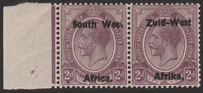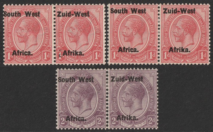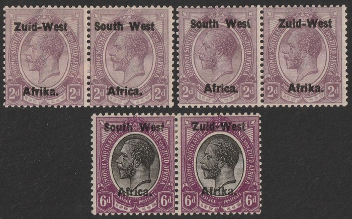 KGV 2d dull purple, bilingual horiz pr with variety '2 dots before Africa' plus another 2d pr & 6d pr both with variety 'broken T in West'. F-VF fresh MLH. Scott 3 & 6(var). SG 3 & 6(var) cat £33 as normals. (Image1)