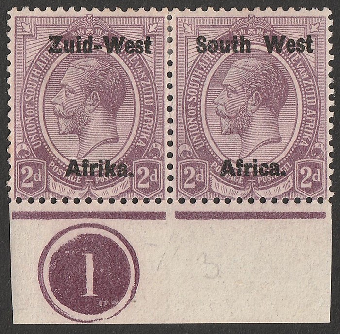 KGV 2d dull purple, bottom marginal bilingual horiz pr with plate no. 1. VF fresh M. Scott 3 cat US$10+. SG 3 cat £12 plus premium for plate no. (Image1)