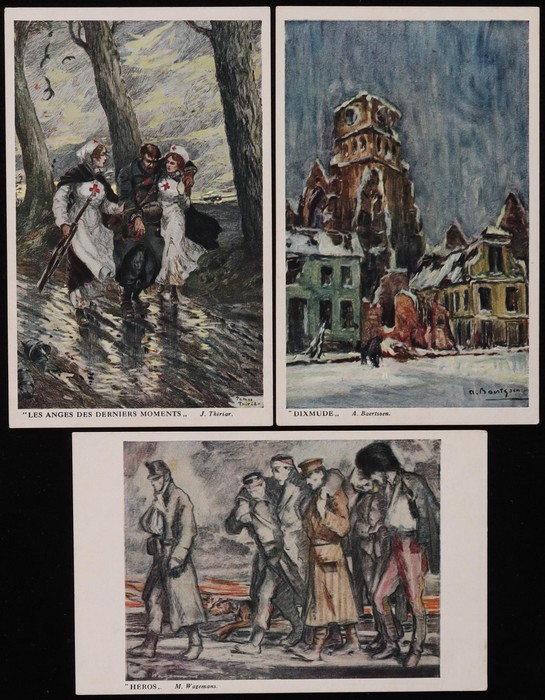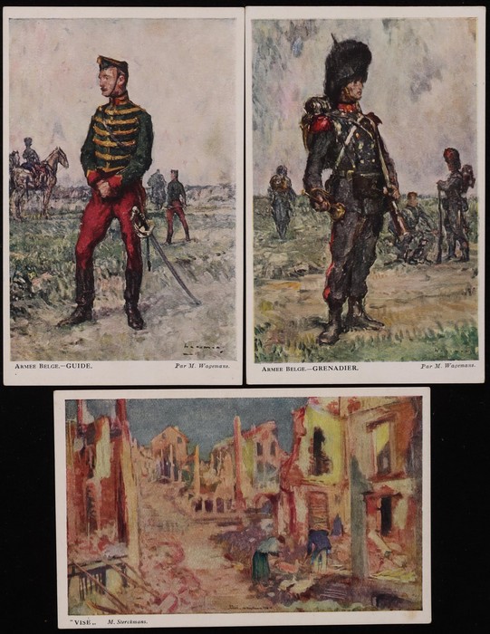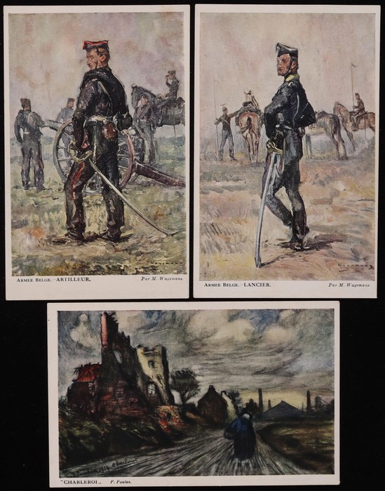 Des Soldats Invalides Belges set of 12 colour artist PPC inc Battle Damage, noted Ypres & Charleroi & Soldiers inc Artilleur, Grenadier & Lancier. Some light rev foxing o/w VF condition. (12) (Image1) (Image2)