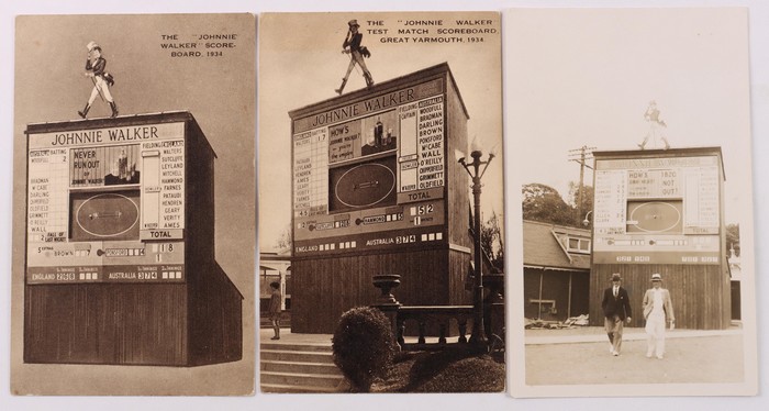 v Australia Test Match 'Johnny Walker' Scoreboard Cards (3) with 1st Test (June) Nottingham 2nd afternoon, 5th Test (Aust) Final Scores (Aust won by 562 runs) & unknown Test with Aust 1/18 2nd innings. Some minor foxing on last. VF UN. (3) (Image1) (Image2)