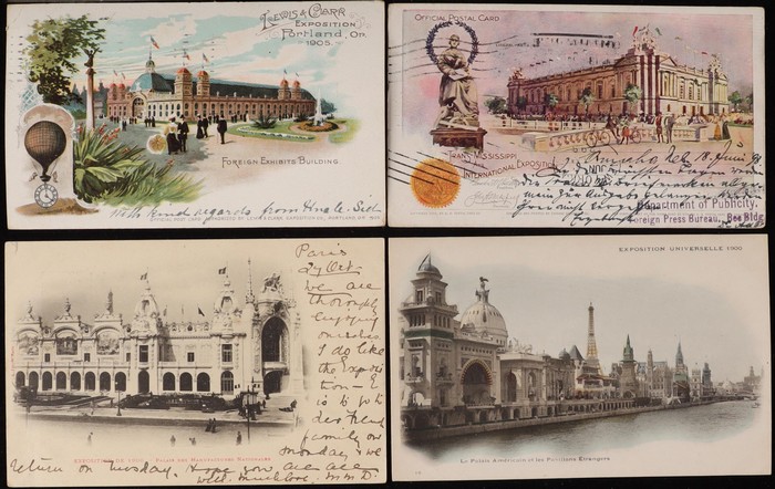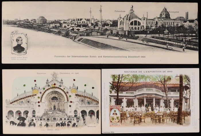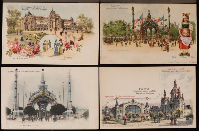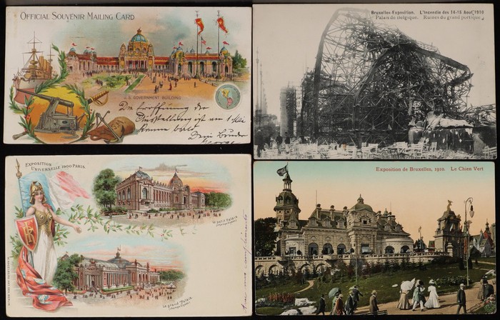 Exhibitions collection inc Budapest 1896 (10), Paris 1900 (24), Dusseldorf 1904 (double card), Liege 1905 (8), Brussels 1910 (7). USA, Columbian Expo 1893 (6) plus booklet of 12 Photogravures, other Expos (10) inc Trans-Mississippi Expo with 1c