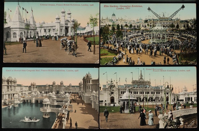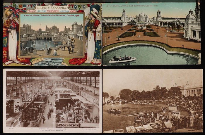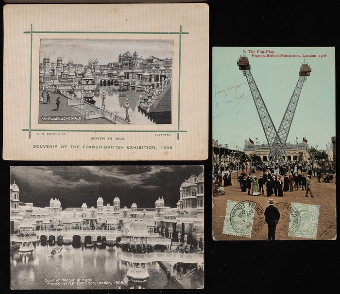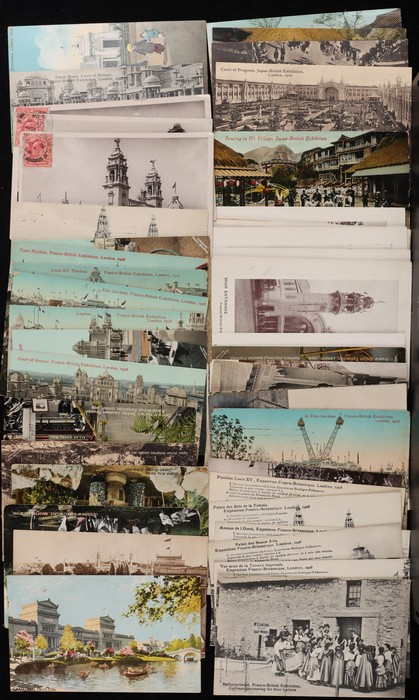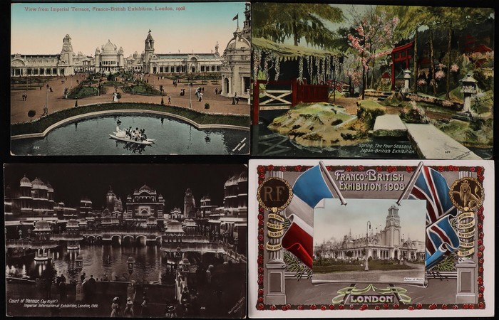 Exhibitions collection inc Franco-British Exhibition 1908, with woven silk by Grant & Co, other Animated Scenes of many diff Pavilions (42), Japan-British Exhibition 1918 (8), British Empire Exhibition 1924 (5) plus others. Some colour. G-VF. All