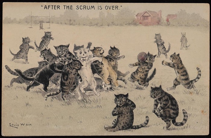Wain Cat card After the (rugby) scrum is over. Un-divided back with reverse embossing for subtle '3 dimensional' effect. VF UN. Illustrated on page 36 in Booth & Lund 'Louis Wain' pub 2003. (Image1)