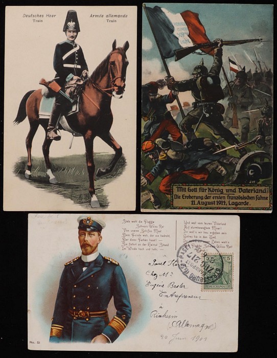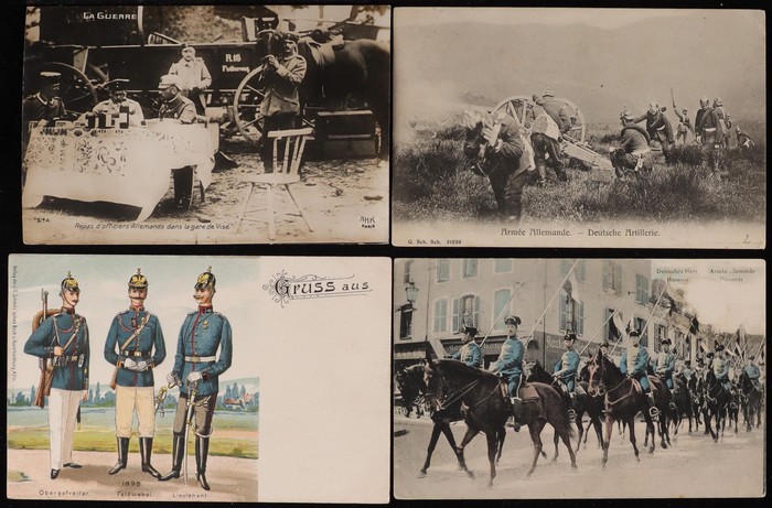 French/Belgian mostly pre 1914 inc undivided backs, wide image inc Uniforms, Parades, Exercises, Groups in Camp, Military Scenes. Many with stamps & pmks. Pmks inc Railway Post/TPO, Field Post Office. Mostly VG-VF. All diff. (63) (Image1) (Image2)