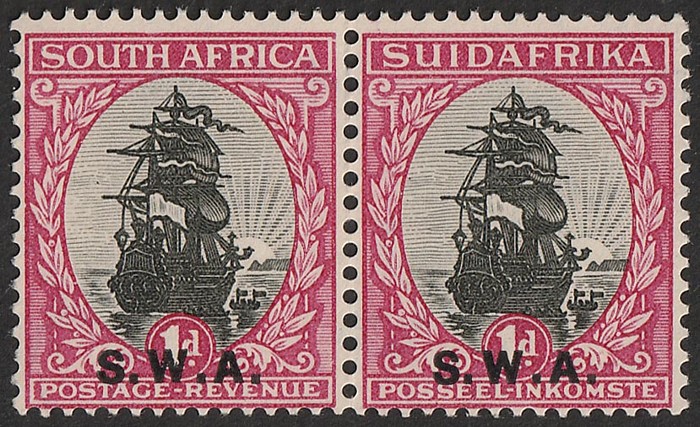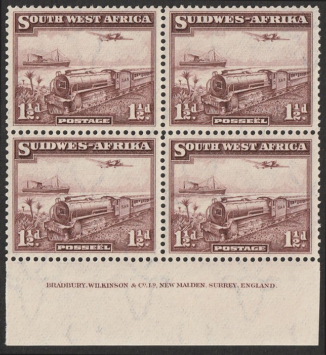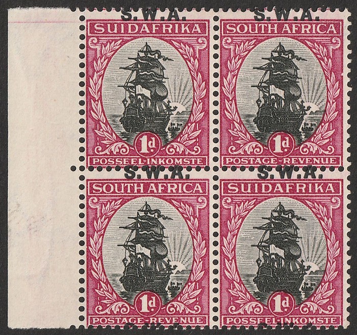 1930-31 'S.W.A.' opt Ship 1d black & carmine, bilingual blk of 4, Rotogravure printing. VF fresh MNH. Scott 107 cat US$30 for M. SG 69 cat £36 for M, should be at least double £72 MNH.
