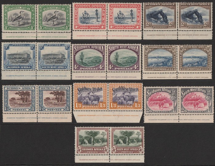 ½d to 5/-, all bottom marginal bilingual horiz prs with Bradbury Wilkinson & Co imprint. VF fresh M/MLH. Scott ex 108-118 cat US$69+. SG 74-83 cat £74 plus premium for imprint prs should be at least double £148. (10 prs) (Image1)