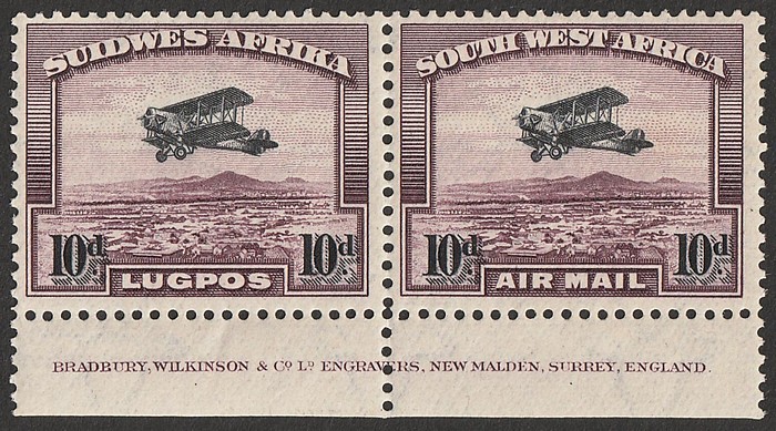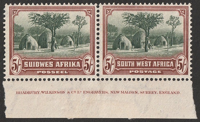 5/- sage-green & red-brown, bottom marginal bilingual horiz pr with Bradbury Wilkinson & Co imprint. Stamps VF fresh MNH. Scott 118 cat US$17+. SG 83 cat £20 for M, should be at least double £40 MNH plus premium for imprint pr. (Image1)