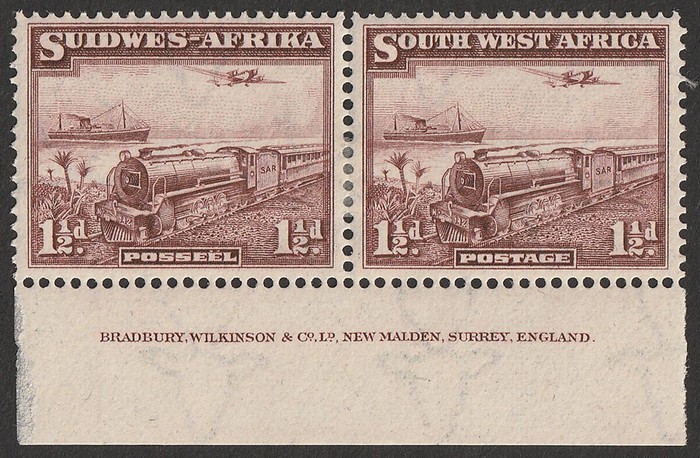 1½d purple-brown, bottom marginal blk of 4 with Bradbury Wilkinson imprint. VF fresh MNH. Scott 110 cat US$60 for prs. SG 96 cat £60 for prs plus premium for imprint blk. (Image1)
