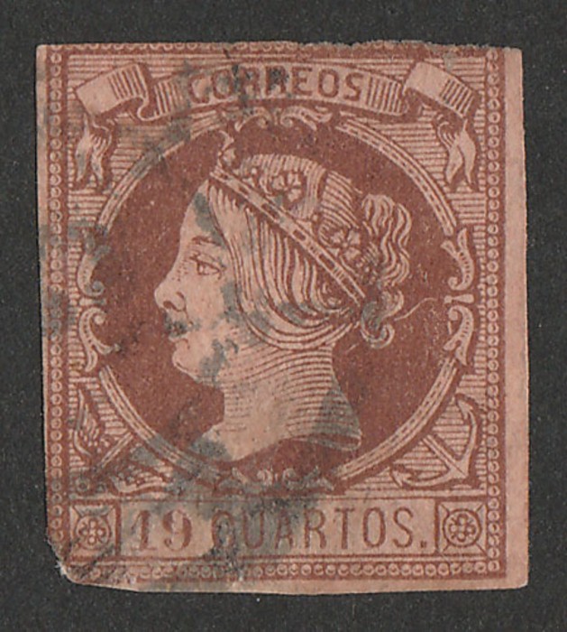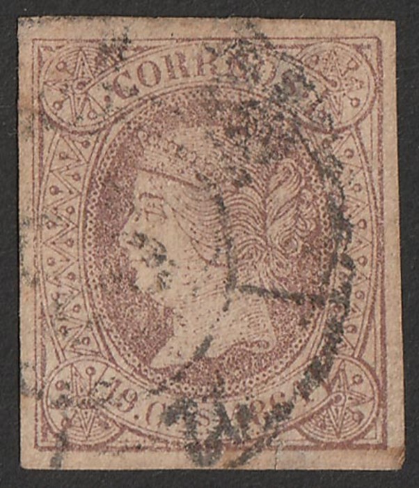 brown on brown. U, 2½ margins, cnr fault, black wagon wheel pmk. Scott 52, SG 66 cat £1700, Edifil 54a cat €2300. Rare genuine example. (P) (Image1)