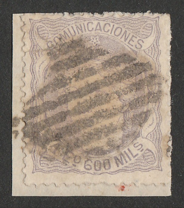 'Spain' 1E600m grey-lilac. GU, on piece with barred diamond pmk, small tear at left but NO punch cancel. Scott 170, SG 183 cat £1000, Edifil 111 cat €1475. Very rare genuine postally used. (P) (Image1)