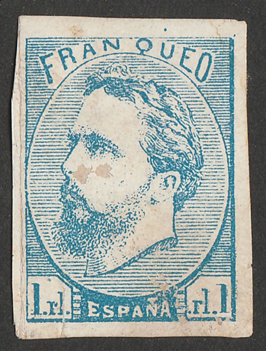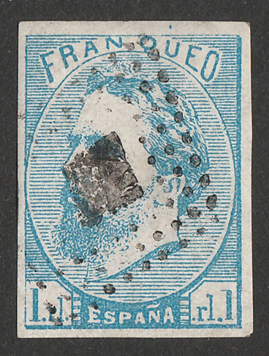 blue with 'tilde' over 'N' of 'ESPANA', imperf. VFU appearance, 4 margins, thin, diamond dotted pmk. Scott X2 cat US$275, SG C3 cat £475, Edifil 156 cat €560. Rare genuine. Exp Scheller. (P) (Image1)