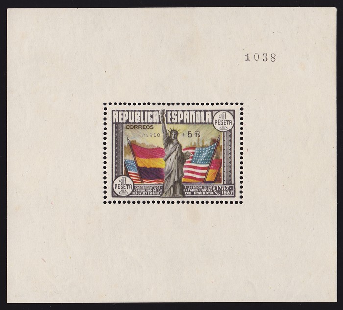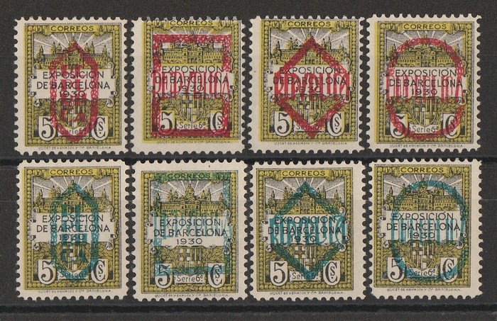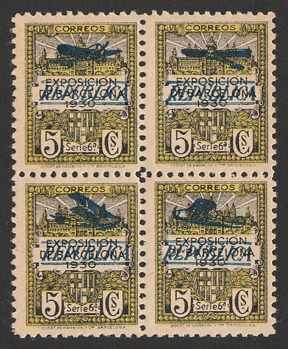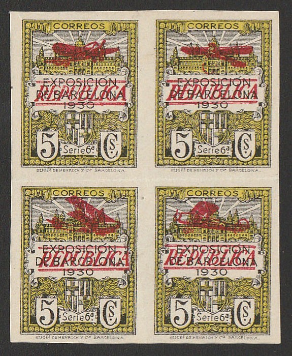 Civil War set 1P-15P, opt MUESTRA (specimen), all in blks of 4. VF fresh UN. SG 857a-857e(s) cat £2600 for normal singles. Ed 775-80M cat €1944+ as singles, while specimen multiples are extremely rare. (24) (P) (Image1)
