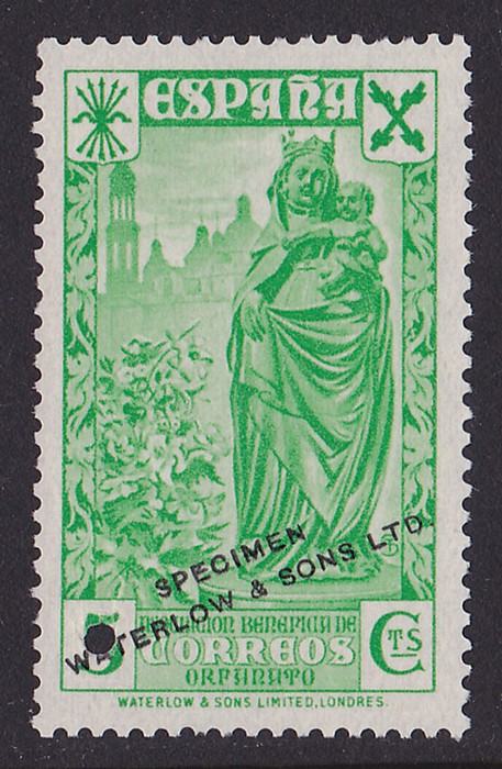 Orphans 5c green printer's sample proof (instead of lilac) opt 'Waterlow & Sons Ltd Specimen' with small security punch. VF fresh UN as made. SG unlisted, Ed 21MT cat €100.