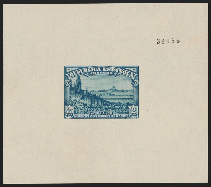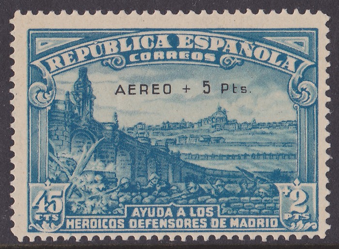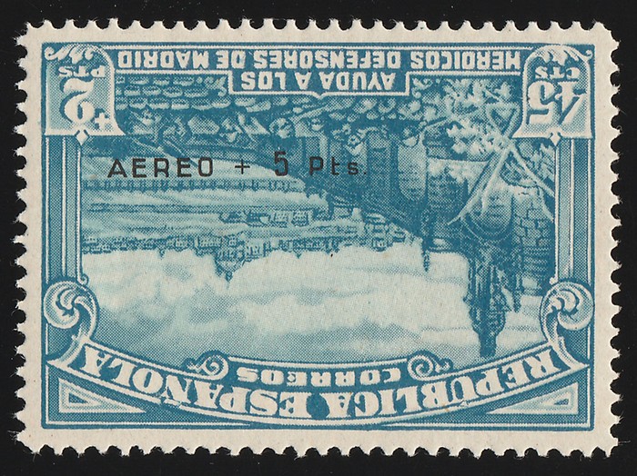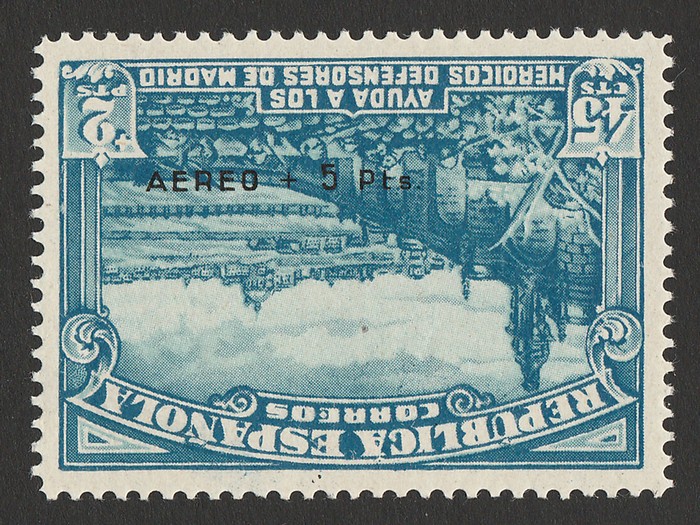 opt Defence of Madrid 45c+2P dull blue & light blue, error opt INVERTED over lower portion of design. Superb fresh MNH. SG 841(var), Ed 759hi cat €1570. Very rare genuine. Exp Roumet, plus 2021 Ceremuga photo cert. (P) (Image1)