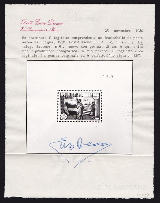Constitution 1P+5P Airmail opt M/Sheet, no.1038. Superb fresh MNH. Ed 766 cat €2500; Sc C97c cat US$2500. SG MS848 cat £1500 for M, so should be at least double, £3000 MNH. Only 2000 printed & seldom seen MNH. Dr Enzo Diena AIEP