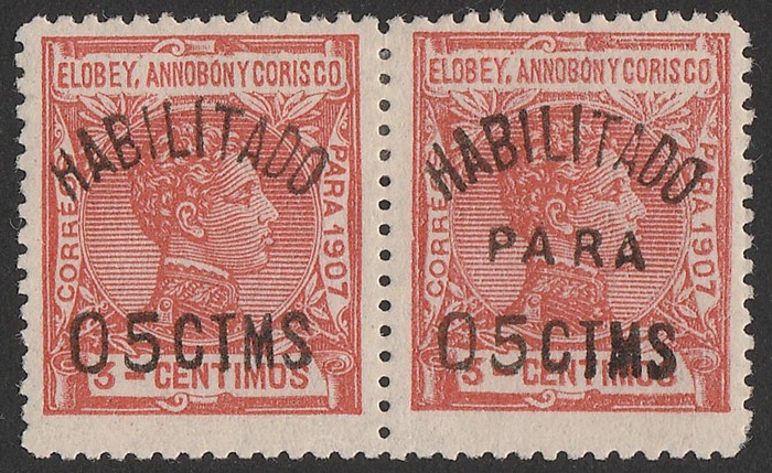 Corisco: 1908-10 'HABILITADO PARA' opt King 3c orange-red, horiz pr, left stamp 'PARA' omitted. VF fresh M. Sc 57(var), SG 59(var), Ed 50Che + 50C cat €26+ as singles, plus premium for positional se-tenant pr, which should be 50%, so est cat
