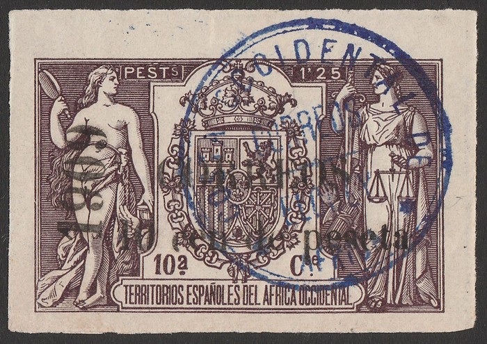 Corisio: '1909 CORREOS 10 Cen de Peseta' opt Arms Fiscal 1P25 lilac imperf, with control no on back. Superb U, 4 margins, blue cds. SG 64 unpriced. Ed 50J. (Image1)