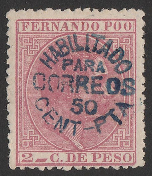 1884-93 'Habilitado Para Correos' opt Alfonso 50c/2c rose, opt in blue. VF fresh M. Sc 11. SG 10A cat £42, Edifil 10A cat €50. (Image1)