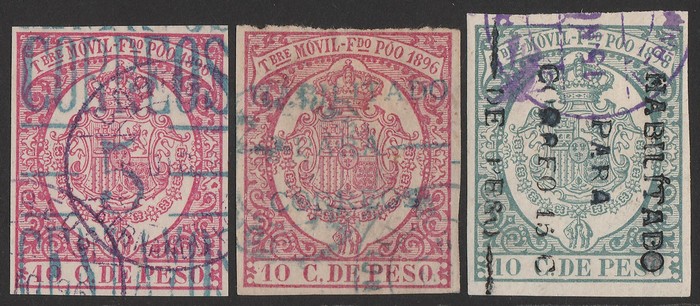 'CORREOS 5 CENTAVOS' blue opt Arms Fiscal 10c rose-red. 1896 'HABILITADO PARA CORREOS 15c' black vert opt Arms 10c blue-green. VFU, all 4 margins. Sc 39-41. SG 31, 32 & 61 cat £70. Ed 41A, 41B & 43 cat €64. (4) (Image1)