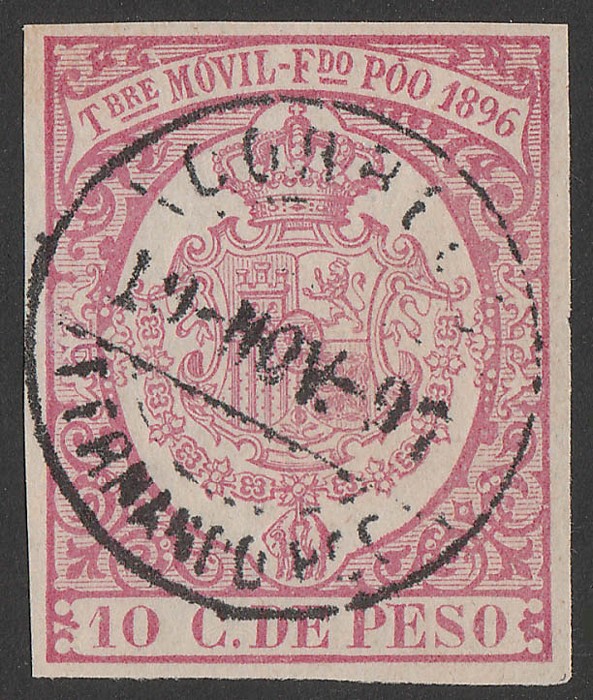 Arms 10c rose-red Postal Fiscal, imperf. VFU, 4 margins, Postal 'CORREOS 19 NOV 97 FERNANDO POO' cds. Sc Unlisted. SG footnote after 32 unpriced. Ed 41 cat €215. (P)
