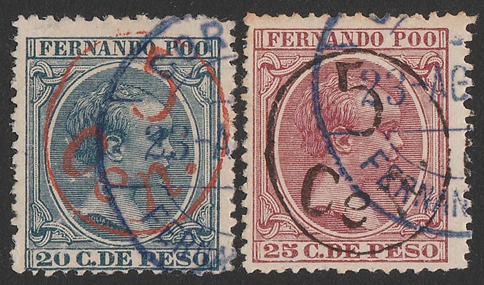 1896-98 '5 Cen' in circle opt Baby 20c indigo, red opt, & 25c pale lake, black opt. VFU. Sc 32 & 33. SG 41b & 42a unpriced, Edifil 40H $ 40J cat €65. (2) (Image1)