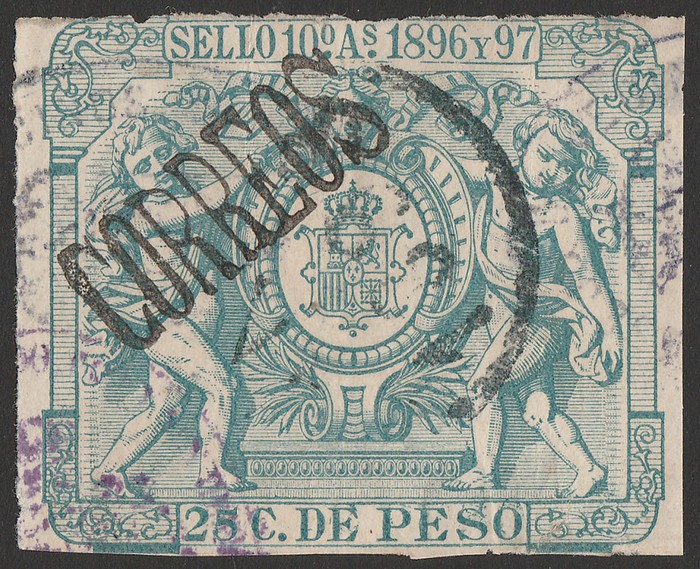 1898-99 'ANO 1898' & 'CORREOS' black h/s Arms 25c green. U with violet h/s, thins, almost 4 margins. SG & Sc unlisted. Ed 46A cat €330. Very rare. (P) (Image1)