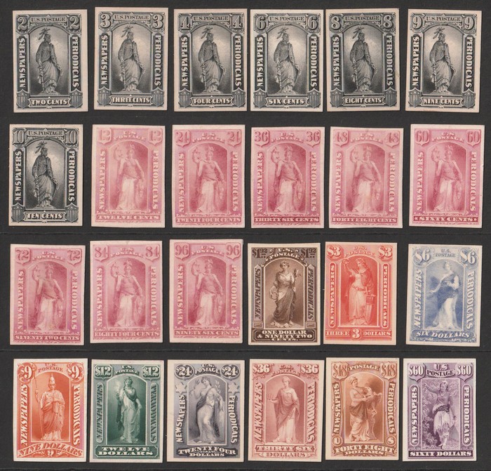 Periodical set 2c-$60, plate proofs on card, imperf, in issued colours, Continental printing. Superb UN as made, all 4 margins. SG N180-N203(p) cat £50,300 as normals. Sc PR9P4-PR32P4 cat US$318 (normals cat US$56,875). (24) (P) (Image1)