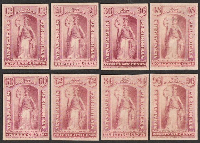 Periodical 12c-96c rose, Continental Bank Note Co printing, plate proofs on card, imperf, in issued colours. VF UN as made, few reverse blemishes, all 4 margins. SG N187-94(p), cat £9800 as normals. Sc PR16P4-PR23P4 cat US$96 (normals cat