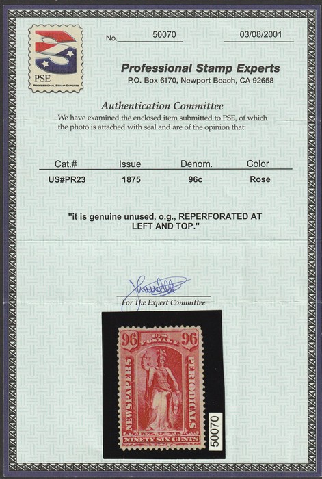 Periodical 96c rose, Continental printing on hard paper. F-VF fresh M, original gum, reperfed at left & top. SG N194 cat £1400. Sc PR23 cat US$2250. Very rare M. 2001 PSE photo cert. (P) (Image1) (Image2)
