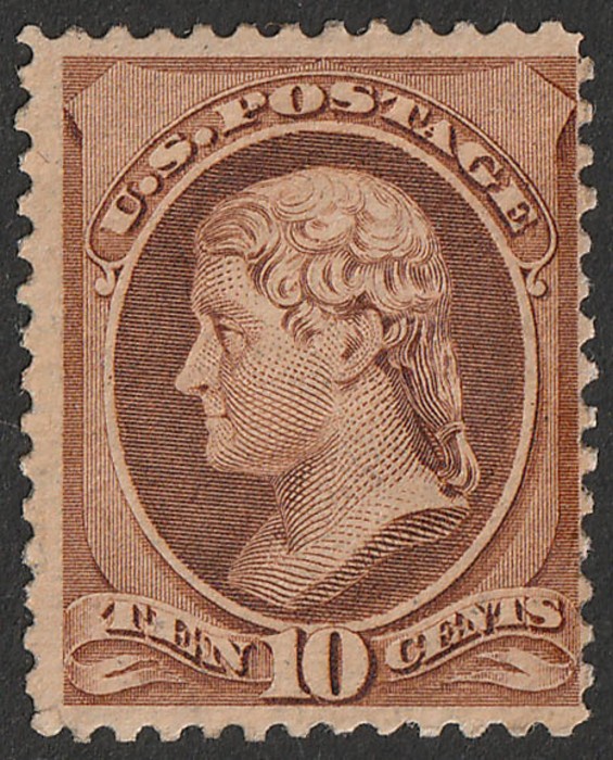 10c brown, National Bank Note Co, no grill. F-VF M/UN, disturbed partial gum, LL cnr perf split. Scott 150 cat US$2000. SG 163 cat £1100. Or could be 1879 Jefferson 10c brown, American Bank Note Printers. Scott 188 cat US$1800. (P) (Image1) (Image2)