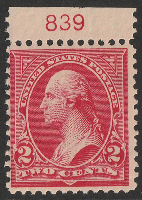 Washington 2c red, type IV, wmk USPS, top marginal with plate number 839. F-VF fresh MNH. Scott 279B cat US$25+. SG 284 cat £11 for M, should be at least double, £22 MNH plus premium for plate no. (Image1)