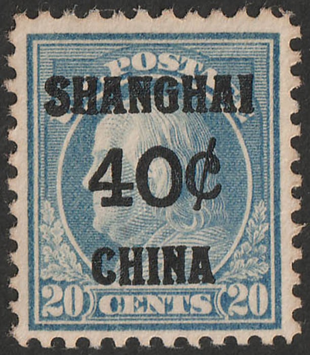 'SHANGHAI 40c CHINA' opt Franklin 20c deep-ultramarine. VF fresh M. Scott K13 cat US$120. SG 13 cat £170. (Image1)