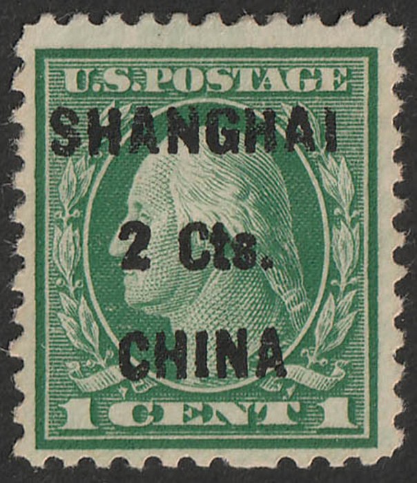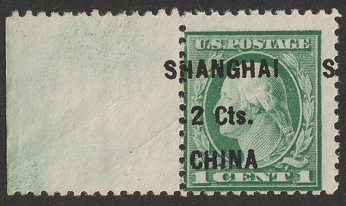 'SHANGHAI 2 Cts CHINA' opt Washington 1c green, error 'opt shifted left reading HANGHAI S'. VF fresh MNH, left marginal. SG 17(var) cat £160+ for normal M, should be at least double, £320+. Sc K17(var) cat US$225+, plus premium for