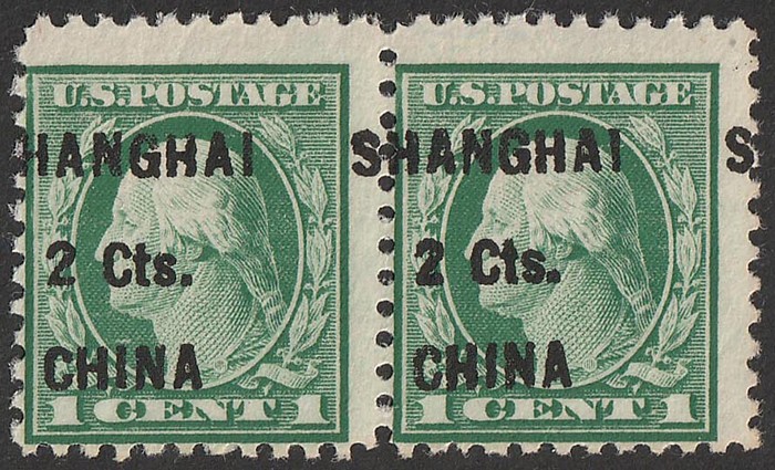 'SHANGHAI 2 Cts CHINA' opt Washington 1c, horiz pr, error opt shifted left, reading 'HANGHAI S'. F-VF fresh MNH. SG 17(var) cat £320 for normal M singles, should be at least double, £640 MNH. Scott K17(var) cat US$450 plus premium for