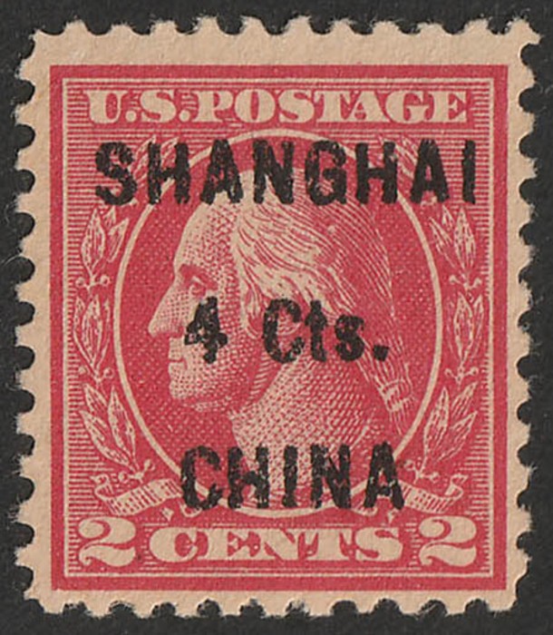 'SHANGHAI 4Cts CHINA' opt Washington 2c carmine. VF fresh MLH. Scott K18 cat US$100. SG 18 cat £140. (Image1)