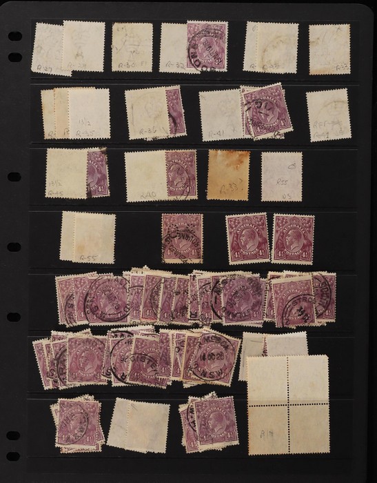 collection on hagners inc single wmk shades, perf OS (3), major varieties 'retouch RVT & numeral' (1R29), 'deformed left frame & break' (1R55) etc, 4½d violet small mult perf 14 shades, perf OS, variety 'deformed left frame with break' (1R55