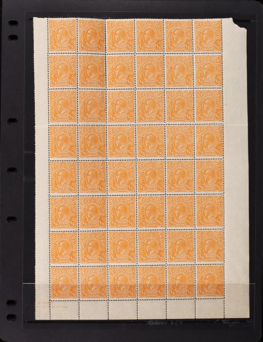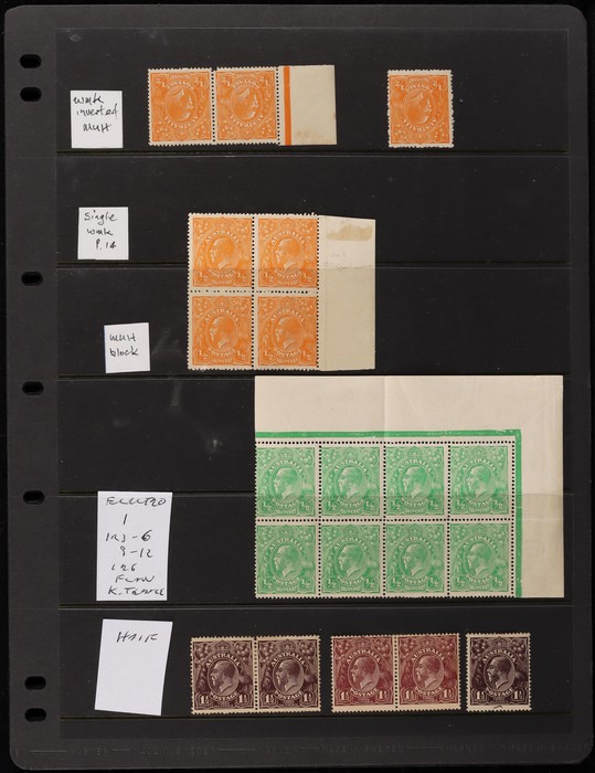 ½d green to 1/4 turquoise MLH/MNH on hagners inc ½d orange single wmk inv wmk marginal blk of 20, ½d orange SM wmk perf 14 blk of 48 Electro 8 with varieties, 4d orange & yellow-orange inc wmk, 4d lemon-yellow, 5d chestnut single